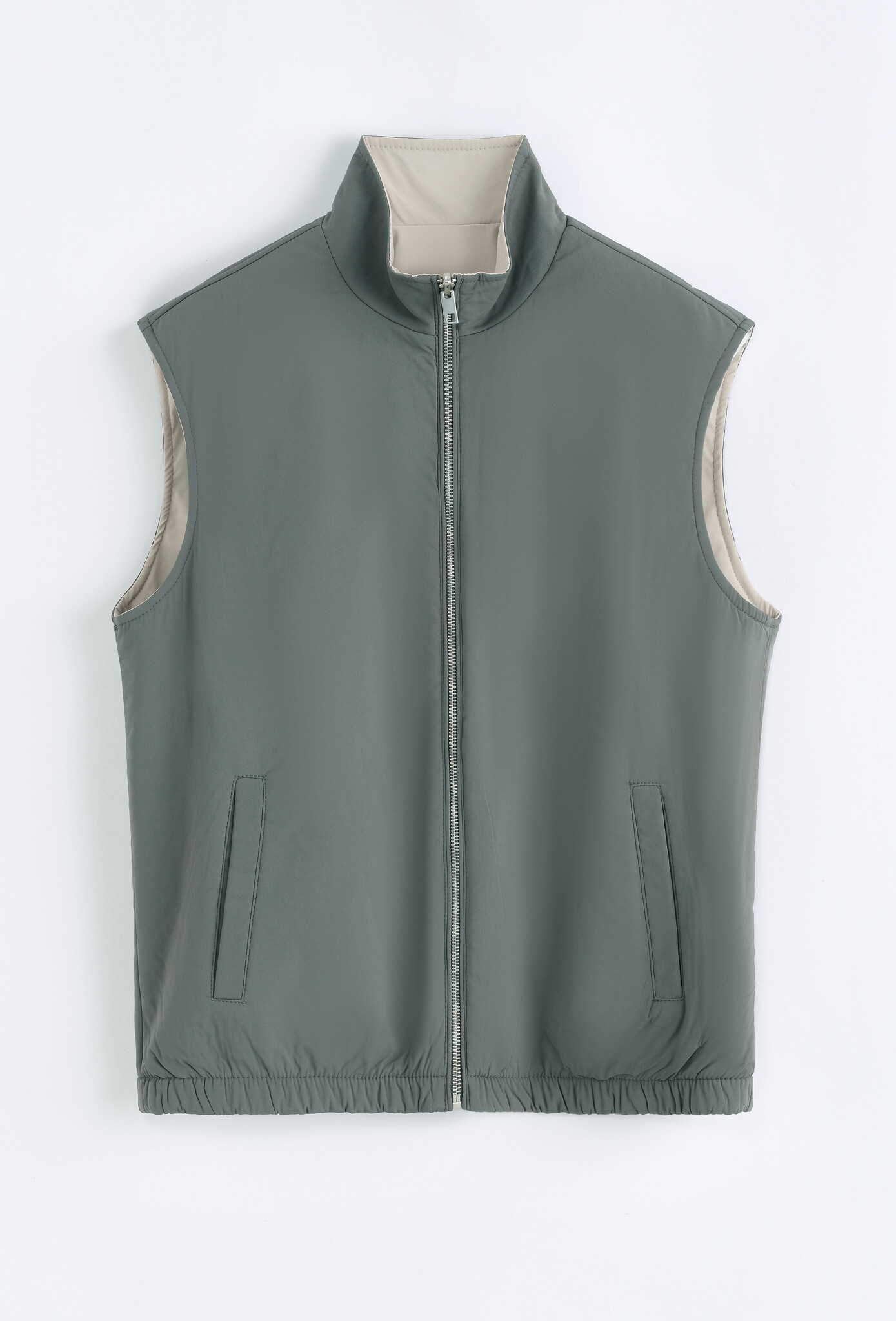 Heren bodywarmer gemaakt van dun kwaliteit. Deze bodywarmer kan twee kanten gedragen worden. Deze bodywarmer sluit met een elastische boord en rits sluiting. De bodywarmer heeft twee steekzakken en 1 binnenzak