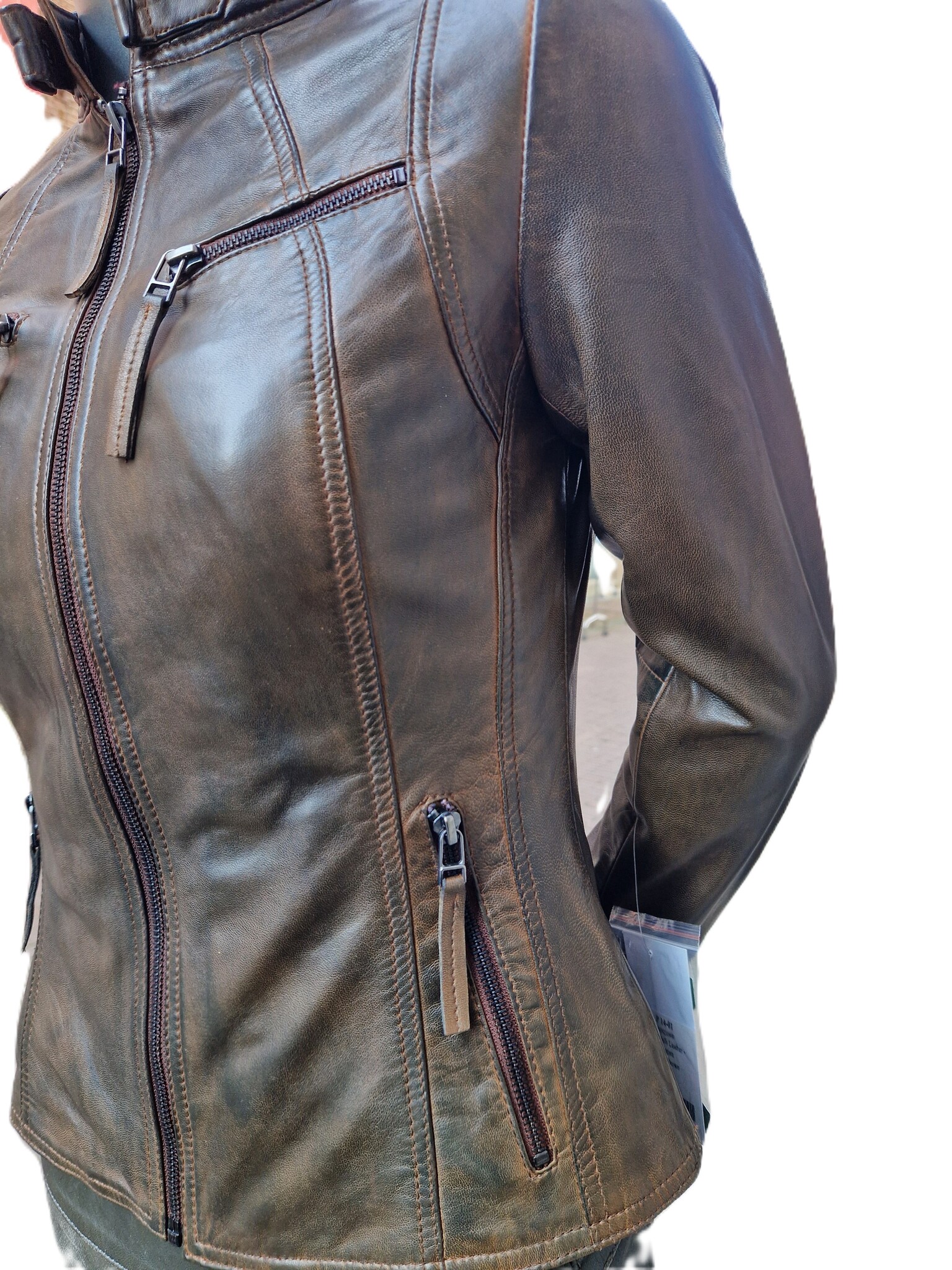 De bruine biker jack is goed getailleerd. De jas sluit goed aan om je lichaam en zit comfortabel. Door het dragen van deze leren biker jas loopt het leer uit en vormt naar je lichaam.
