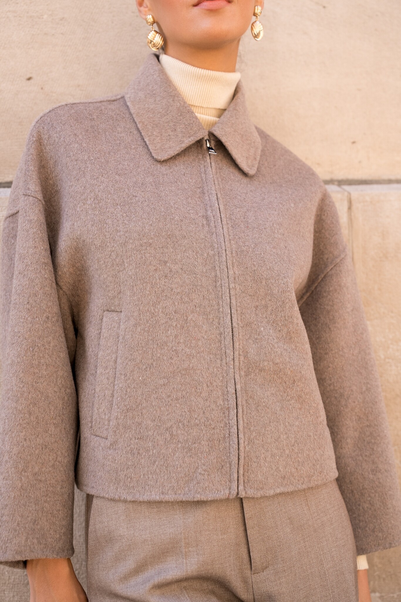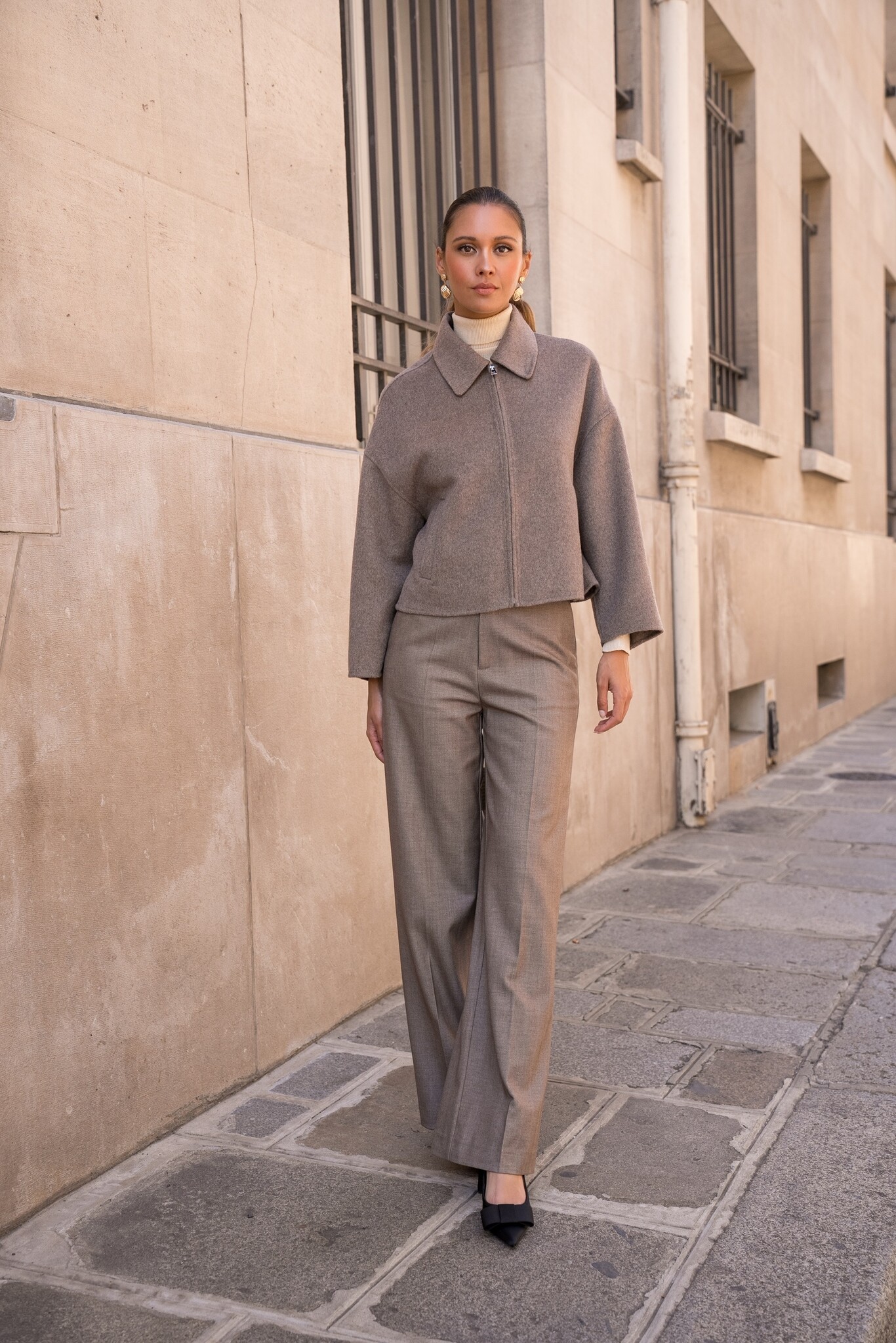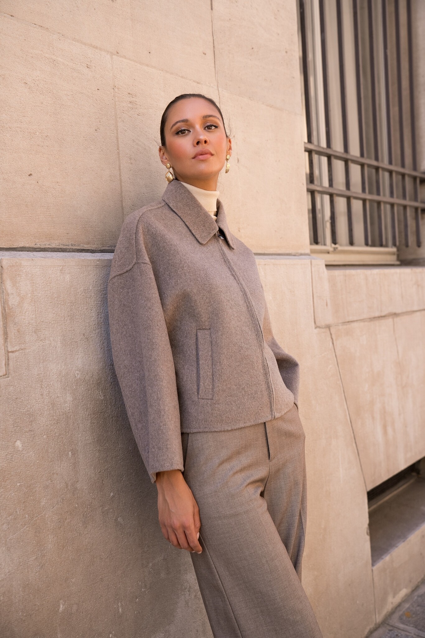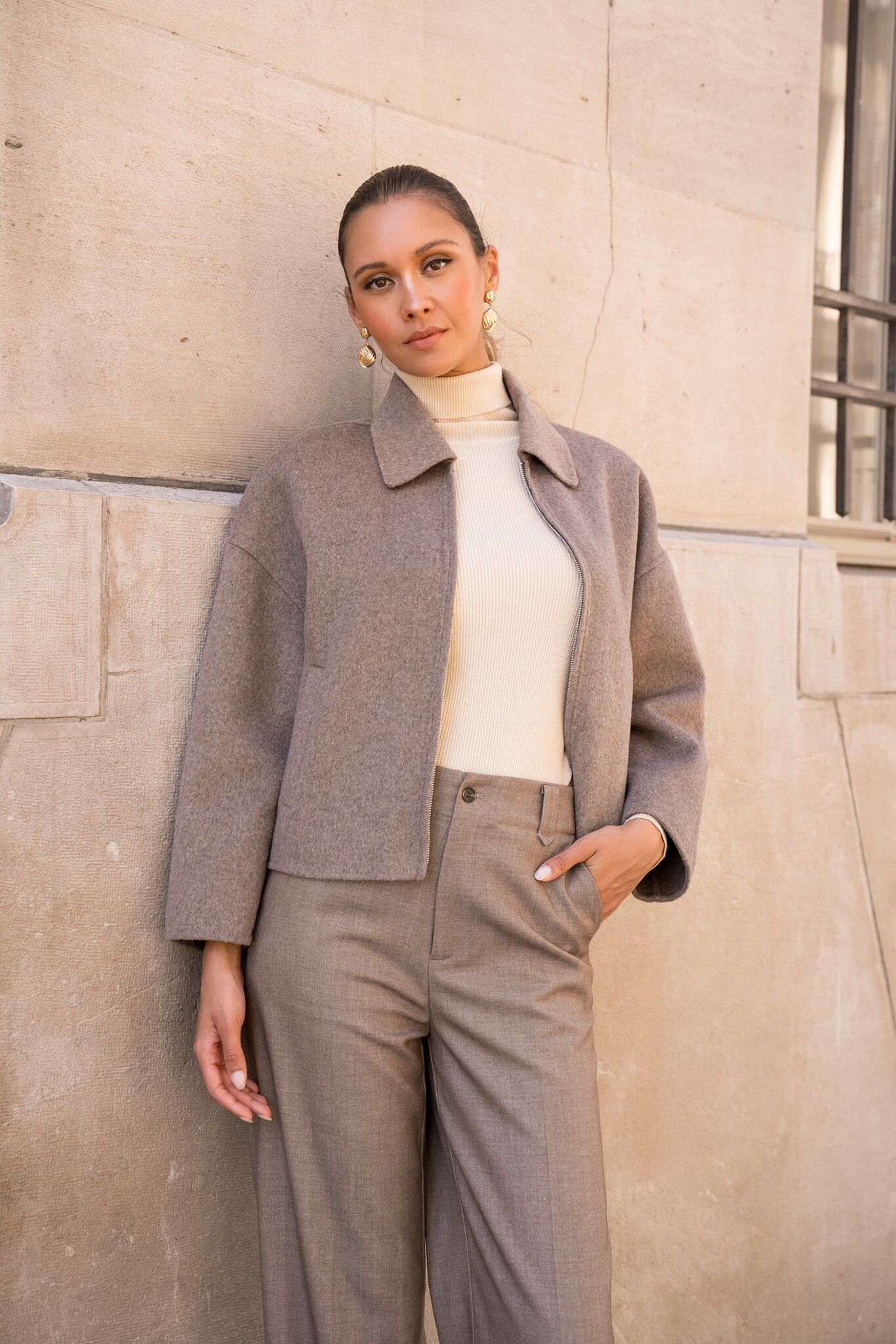 Deze handgemaakte wollen jas is op maat gemaakt voor een luxe look. Deze kort wollen jas heeft twee steekzakken. De jas is gemaakt van een zachte wolmix en volledig gevoerd.