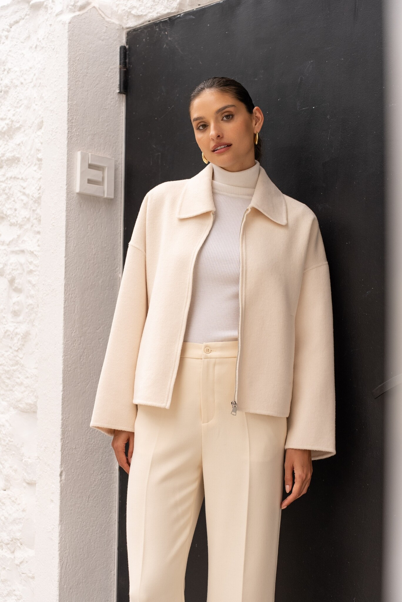 Deze handgemaakte wollen jas is op maat gemaakt voor een luxe look. Deze kort wollen jas heeft twee steekzakken. De jas is gemaakt van een zachte wolmix en volledig gevoerd.